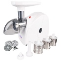 Номинальная мощность: 230 Вт • Реверс: есть • Производительность: 1.7 кг/мин • Вес: 4.35 кг • Насадки-решетки: Есть, 2 штуки (7 мм, 5 мм) • Насадки-терки: Есть, 2 • Прочие насадки: для приготовления кеббе, для приготовления колбас • Отделение для хранения насадок: есть • Резиновые ножки: есть • Лоток для подачи продуктов: есть, пластик • Цвет корпуса: белый • Материал корпуса: пластик