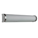Накладной светильник стиля техно для ванной имеет размеры 450x90x86 мм. Арматура светильника окрашена в хромовый цвет. Лампы в комплекте - отсутствуют. В светильнике применяются лампы накаливания или светодиодная LED-лампа. Цвет плафонов - белый, с матовой поверхностью. Материал плафонов - стекло. Класс электробезопасности - I, степень пылевлагозащиты (IP) - IP44. Максимальная мощность лампы (Вт) - 40. Светильник размещается на потолоке и стене.