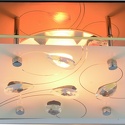 Накладной светильник стиля модерн для гостиной, кабинета, прихожей или спальни имеет размеры 240x240x90 мм. Арматура светильника окрашена в хромовый цвет. Лампы в комплекте - отсутствуют. В светильнике применяются лампы накаливания или светодиодная LED-лампа. Цвет плафонов - белый с рисунком, с матовой, прозрачной поверхностью. Материал плафонов - стекло. Класс электробезопасности - I, степень пылевлагозащиты (IP) - 20. Максимальная мощность лампы (Вт) - 60. Светильник размещается на потолоке и стене.