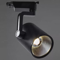 Отличный вариант трекового светильника для освещения торговых помещений. Оригинальная конструкция крепления цилиндрического плафона к кронштейну позволяет регулировать направление потока света и создавать зоны с концентрированным освещением. Монтаж осуществляется на шинный провод, что сокращает время установки и замены в случае необходимости. Материал арматуры — металл, поверхность матовая чёрного цвета.