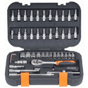 Набор: бит 27 шт, торцевых головок 22 шт • Биты: SL, PH, PZ, T, H • Торцевые головки: 6-гранные, Torx • Посадочный квадрат: 1/4 " • В комплекте: переходник, ключ трещотка, удлинитель, карданный шарнир