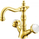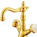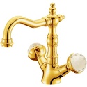 Назначение: для умывальника • Конструкция: двухрычажный • Монтаж: горизонтальный • Материал: латунь, покрытие - золото • Монтажные отверстия: 1 отверстие • Форма излива: традиционная • Душевая лейка в комплекте: нет • Донный клапан в комплекте: есть