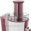 Тип: электрическая центробежная • Мощность: 700 Вт • Емкость резервуара для сока: 1.25 л • Индикатор уровня сока: есть • Автовыброс мякоти: есть • Резервуар для мякоти: 2 л • Размер отверстия для продуктов: 73 мм • Защита от случайного включения: есть • Регулировка скорости вращения: 2 скорости • Цвет: белый, бордовый • Резиновые ножки: есть • Отсек для хранения шнура: есть • Щетка для чистки: есть