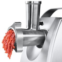 Купил полгода назад. Обычно беру 10-12 кг мяса свинина+говядина. Старой мясорубкой такое количество перемолоть - это мучение, нужно резать мелкими кусками, чтобы не было длинных жил, иначе наматываются на нож. С этой мясорубкой такое количество переработать - минут 15-20. Резать мясо нужно длинными не сильно широкими полосами, жилки не страшны (ну в разумных пределах, а не жилищи, которые не едят). Процесс перемолки потрясающ - она "заглатывает" полосу мяса сантиметров до 20 длиной и пулей выплевывает его. Единственный момент - прижимную гайку надо с достаточным усилием затянуть - несильно, но чтобы нож к решетке прижат был, иначе жилы будут наматываться на нож и реверс не поможет. Насадки кроме мясорубки не сильно нужны, например, "соковыжималка" крутится с бешеной силой, в отжиме не ненужной. А скорость не регулируется.