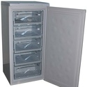Тип: однокамерный морозильник-шкаф • Расположение: отдельностоящий • Количество компрессоров: 1 • Цвет: белый, металлик • Размеры (ШxВxГ): 574x1220x610 мм • Общий объем: 180 л • Минимальная температура: -18 °C (***) • Морозильная камера: ящик x 5 • Годовой расход энергии: 438 кВтч • Мощность заморозки: 14 кг/сут