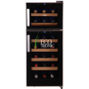 Тип: двухкамерный винный шкаф • Расположение: отдельностоящий • Количество компрессоров: 1 • Цвет: чёрный • Размеры (ШxВxГ): 343x820x540 мм • Количество дверей: двухдверный • Общий объем: 230 л • Винный шкаф: 21 бут. • Управление: цифровой дисплей, электронное • Материал полок: дерево • Класс энергопотребления: D • Годовой расход энергии: 269 кВтч • Максимальный уровень шума: 25 дБ