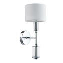Бра стиля модерн для гостиной, кабинета или спальни имеет размеры 140x330x160 мм. Арматура светильника окрашена в хромовый цвет. Лампы в комплекте - отсутствуют. В светильнике применяются лампы накаливания или светодиодная LED-лампа. Цвет плафонов - белый, неокрашенный, с матовой, прозрачной поверхностью. Материал плафонов - текстиль, стекло. Класс электробезопасности - I, степень пылевлагозащиты (IP) - 20. Максимальная мощность лампы (Вт) - 40. Светильник размещается на стене.
