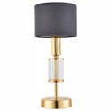 Настольная лампа декоративная стиля модерн для гостиной, кабинета или спальни имеет размеры 140x330 мм. Арматура светильника окрашена в золотой цвет. Лампы в комплекте - отсутствуют. В светильнике применяются лампы накаливания или светодиодная LED-лампа. Цвет плафонов - черный, неокрашенный, с матовой, прозрачной поверхностью. Материал плафонов - текстиль, стекло. Класс электробезопасности - II, степень пылевлагозащиты (IP) - 20. Максимальная мощность лампы (Вт) - 40. Светильник размещается на столе.