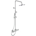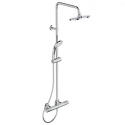 Устройство: душевая система • Смеситель: термостатический • Ручной душ (душевая лейка): размер 100 мм, настройки 3 шт • Верхний душ (тропический): размер 200 мм, настройки 1 шт • Комплектация: ручной душ, верхний душ, смеситель, стойка, шланг, крепление ручного душа