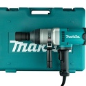 Современный ударный гайковёрт Makita TW1000 имеет прочный алюминиевый корпус ударного механизма, тем самым обеспечивая высокую надежность. У инструмента имеется удобный курковый выключатель с реверсом, компактный редуктор и эффективный ударно-вращательный механизм. Изделие оснащено дополнительной боковой рукояткой с мягкой накладкой. Данная модель отмечается упрощенным доступом к угольным щеткам, что ускоряет и облегчает его техническое обслуживание. В изделии предусмотрено 2 вида закручивания: нормальное — М24-М30 и усиленное — М22-М24. Потребляемая мощность при непрерывной работе: 1300Вт. Инструмент прост в обслуживании и имеет длительный срок службы. Этот гайковёрт – инструмент, предназначенный для выкручивания и закручивания гаек в тех местах, где обычным ключом это сделать невозможно. Makita TW1000 справляется даже с заржавевшими крепежами конструкции благодаря ударной функции. Работоспособность двигателя достаточно высокая, а алюминиевый корпус отлично защищает инструмент от падений и ударов. Гайковерт будет незаменим на масштабной строительной площадке, так как в разы облегчает и ускоряет выполнение работ. На рукояти имеется эргономическая удобная накладка. Поставляется в специальном кейсе.