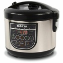 Мультиварки Marta – это набор стандартных функций и интересный дизайн, отличное качество и большие возможности. Средний ценовой диапазон позволяет приобрести изделие британских производителей даже не слишком, в финансовом смысле, благополучному покупателю. Дополнительные программы «Шеф-повар», «Йогуртница», «Детское питание», «Русская печь» позволяют максимально разнообразить питание для всей семьи. Удобный дисплей контролирует не только время приготовления продуктов, но и текущую температуру, которую можно менять в процессе тушения.